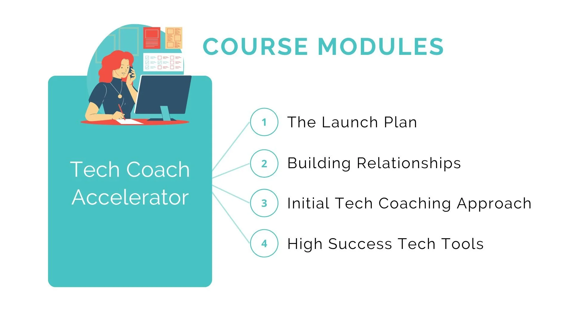 Inside the Tech Coach Accelerator, you will find your Tech Coach Foundational First Steps Playbook and four modules with quick-hit videos that support the playbook and explain more about each step. You will have lifetime access to the courses and course bonuses!